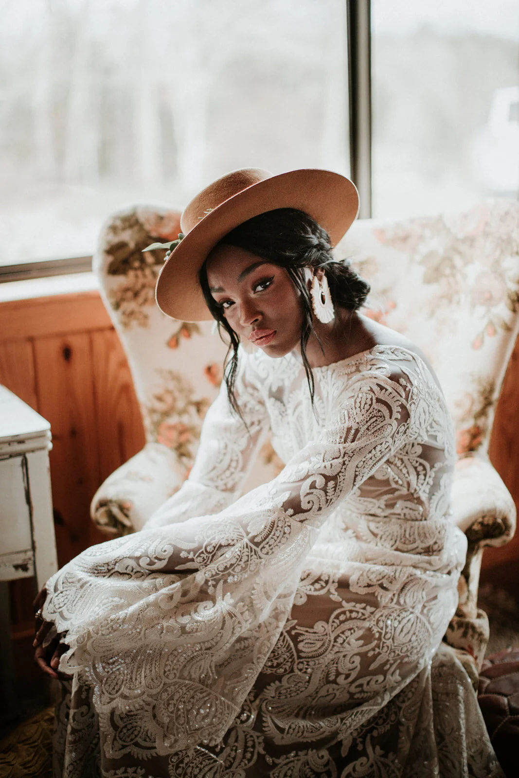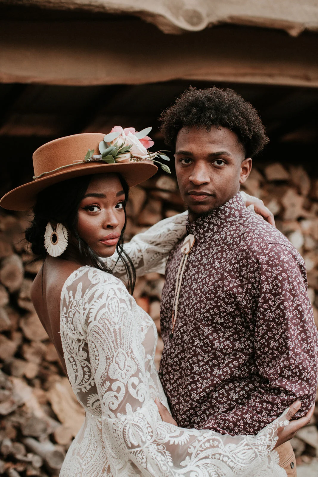 The idea behind this styled shoot was a wedding in the woods theme. Rustic, detail organized and unique. With the brimmed hat adorned with flowers to the unique antique wedding ring. This couple is actually married aside from their fantastic modeling career. Their energy was high and their chemistry was electric.